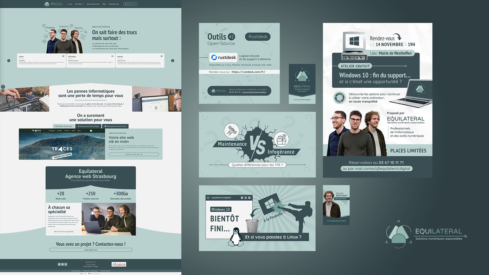 Depuis maintenant 4 ans je travaille de concert Matthias Grosshans et Léonard Class pour proposer avec Equilateral des services autour de la création web et de la maintenance informatique. Le tout, porté par notre volonté de vivre dans un monde plus juste et humain. Retrouve ci-dessous mon travail sur l’identité visuelle de l’entreprise
